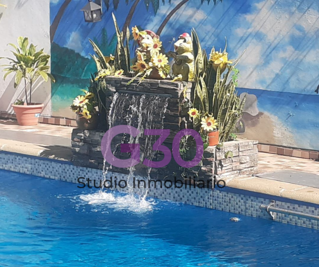 La pileta es de material de 5m x 10 m revestida, con cascada, bomba con filtros en perfecto estado de conservación y uso.