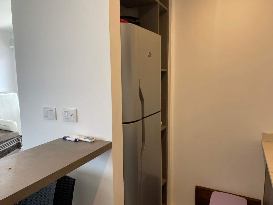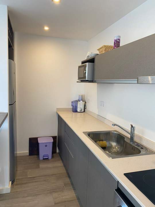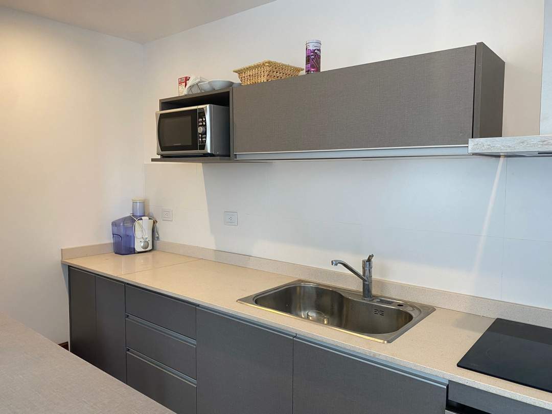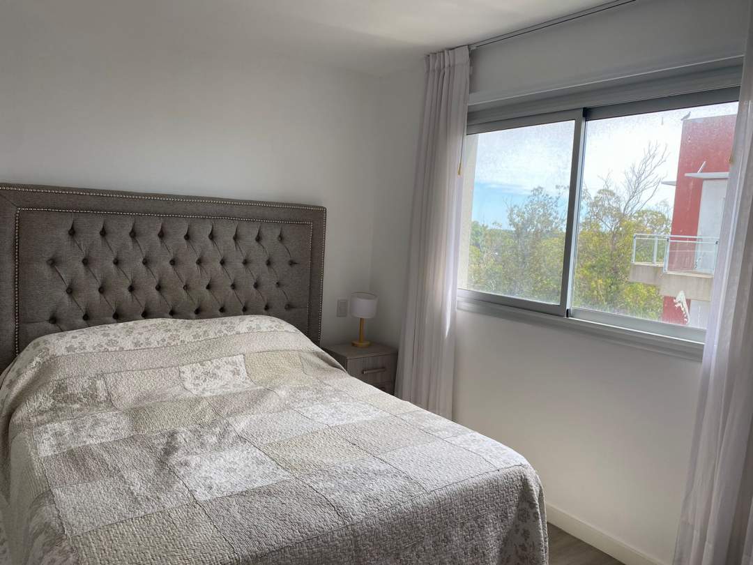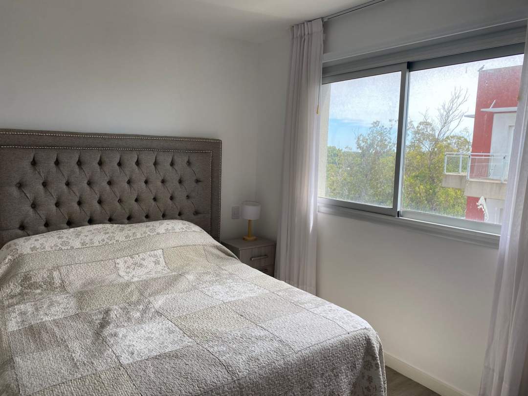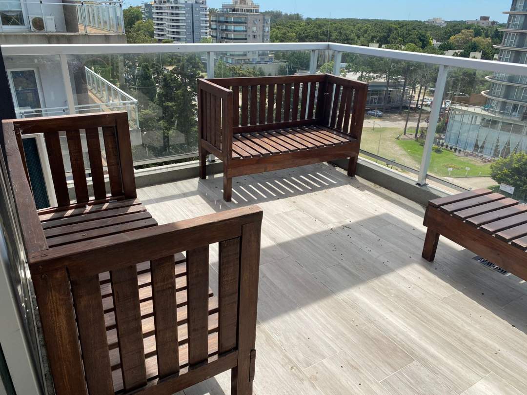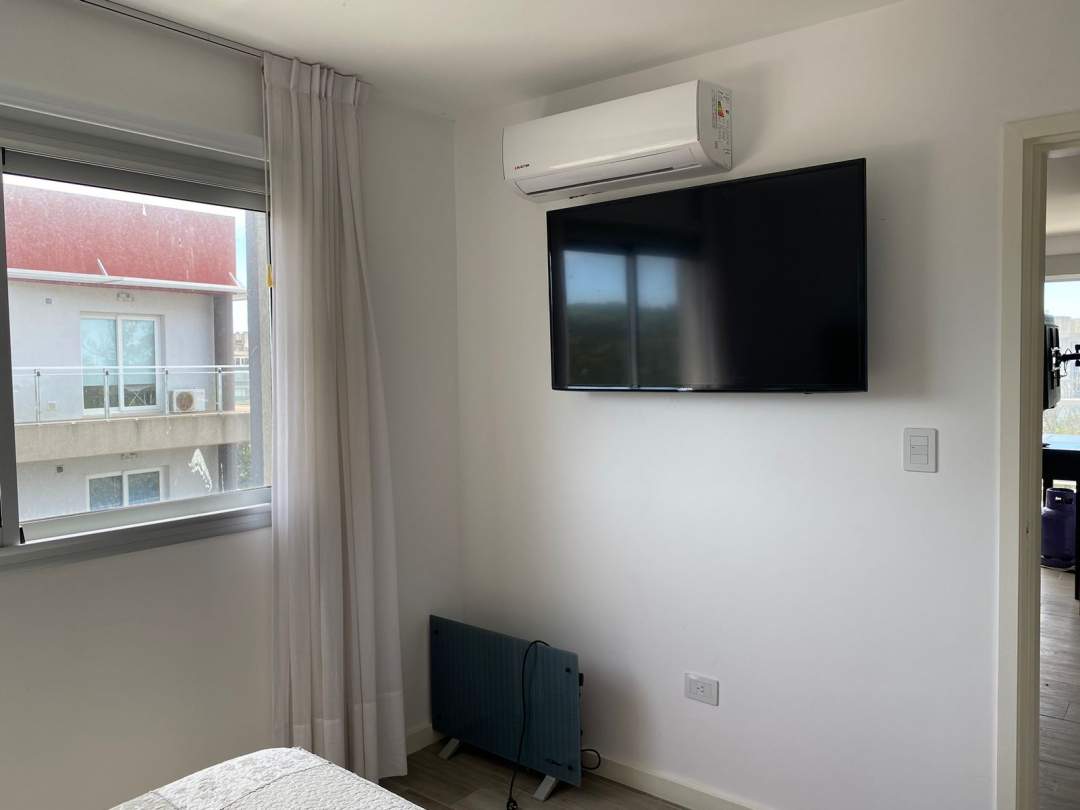 Departamento de 3 ambientes. Cocina integrada con barra, living-comedor con sillón cama y aire acondicionado. Baño con bañera. Dormitorio con cama matrimonial (1.40m) y vista lateral. Balcón con parrilla eléctrica y vista a Av. Bunge. Cochera con acceso por calle del Tuyú.