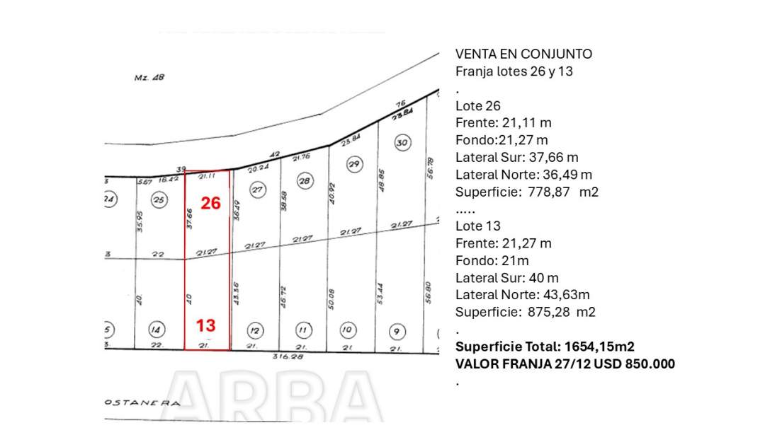 * Lotes 13 (875 m2) y 26 (779 m2): Total 1654 m2, U$S 850,000
