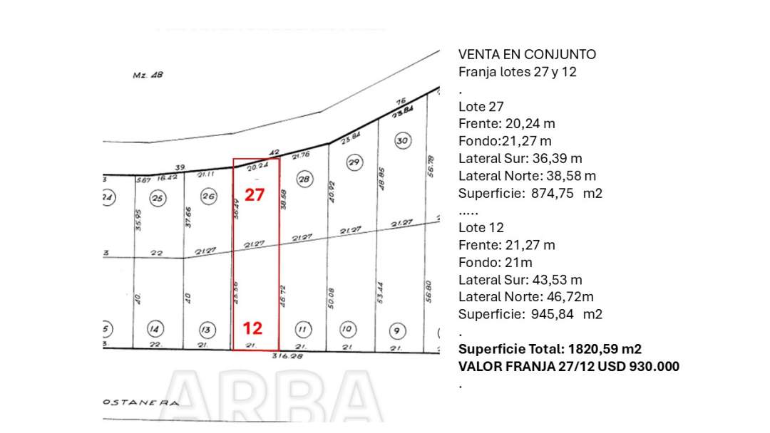 * Lotes 12 (946 m2) y 27 (786 m2): Total 1732 m2, U$S 930,000