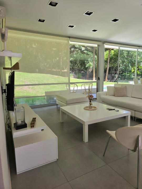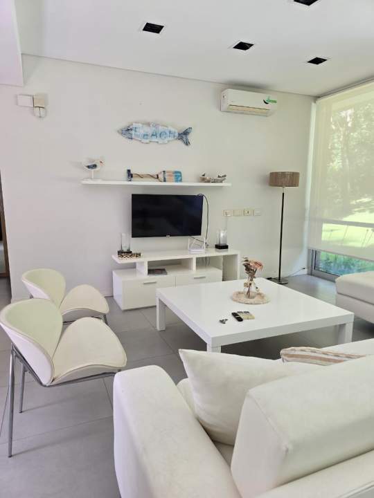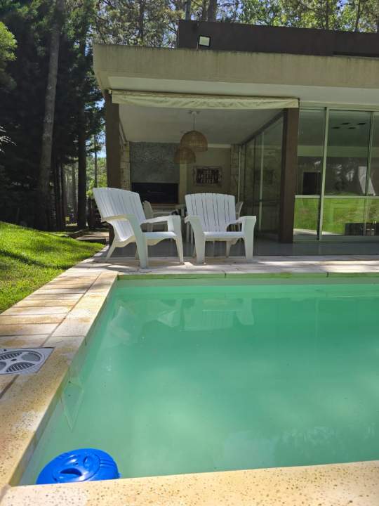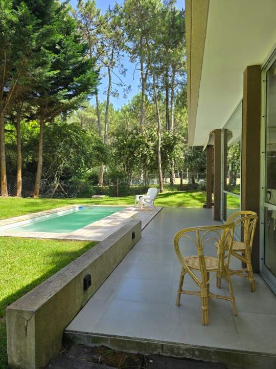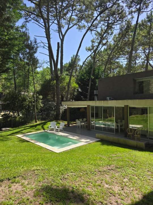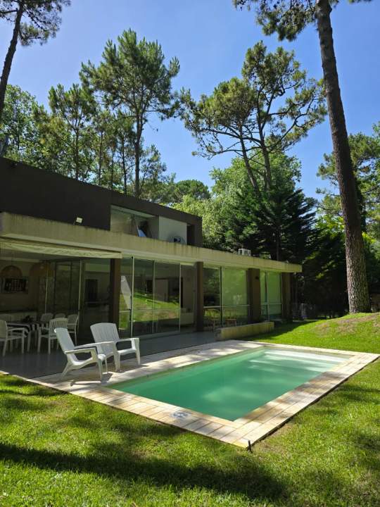 Moderna casa minimalista (296 m² cubiertos sobre 826 m²) en calle Ñandú, frente al golf. Cuenta con cochera descubierta. En planta baja, calefacción por losa radiante, living integrado a comedor y cocina equipada (lavavajillas, anafe y horno eléctricos), lavadero (lavarropas), dependencia de servicio con dormitorio en suite, y dormitorio principal en suite con aire acondicionado. También incluye un toilette y galería con parrilla. La planta alta dispone de calefacción por radiadores, dos dormitorios con aire acondicionado y baño compartido. Baulera exterior y piscina no climatizada.